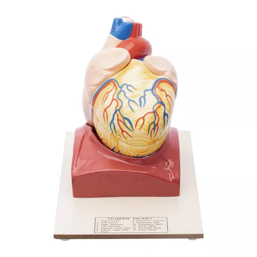 Extra large size and highly detailed model carefully coloured and finished. The heart is cut into 2 parts by a vertical line towards the level of the ventricular septum and separates into 2 parts after the arch of aorta and superior venacava have been removed. Both auricles and ventricles with the bicuspid and tricuspid semilunar valves as well as the sigmoid valves can be seen. Separates in 4 parts. On base with diaphragm and outline of the pericardium, with key card. Size 20cm (width) x 30cm (height)