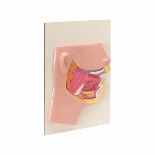 This detailed anatomical model of the human mouth showcases key structures, including the parotid salivary gland, parotid duct, masseter muscle, submandibular salivary gland, tongue, and teeth.