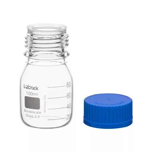 Made  from borosilicate glass with wide mouth and graduated. Complete with a 45mm dia chemical resistant polypropylene screw cap. Can be autoclaved up to 140 degrees