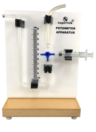 To measure transpiration of water through a plant. Only one glass component ( the capillary tube) and is mounted on a strong backing plate. It consists of a capillary tube with a millimeter scale connected via three way tap to a syringe. The cut shoot is connected to the third outlet. It can also be used to measure humidity by connecting a porous pot to be third outlet. Dimensions overall 155 x 165 x 60mm (width x height x length) Capillary tube 120 x 1mm (length x bore).