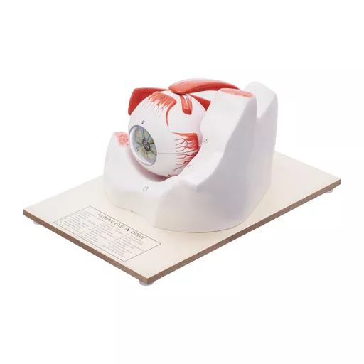 A 3 times enlarged model of the eye, with 9 parts, in bony orbit. The upper half of eye ball is removable and dissects into 7 parts, showing all anatomical details. Out of six muscles controlling the eye ball two are removable. On base, with key card.