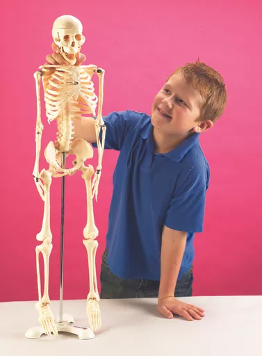 Half scale model of the human skeleton. Produced in lightweight and durable synthetic material. All of the main joints move including the shoulder, elbow, wrist, hip, knee, jaw and ankle. Supplied with heavy metal stand.