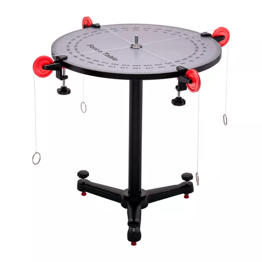 For verifying laws of composition and resolution of forces, comprising a machined aluminium table 40 cm dia., scale graduated 360°, on heavy vertical support rod and tripod base. Complete with one ring, 4 sliding clamp pulleys. Supplied with four cords with rings at one end, without masses.