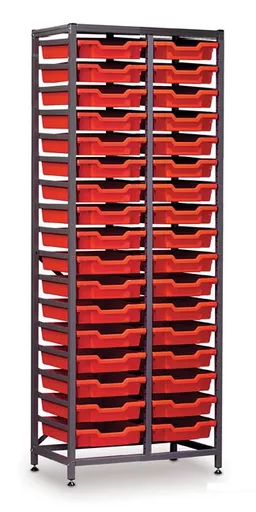 1850mm high x 710mm wide x 420mm deep. Tall Double Column Frame with 34 red Shallow Trays, runners and adjustable feet.